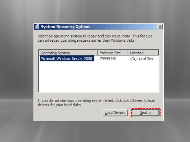● If you are restoring Server 2008 onto separate hardware, the list should be empty (there should be no operating system on the computer).
